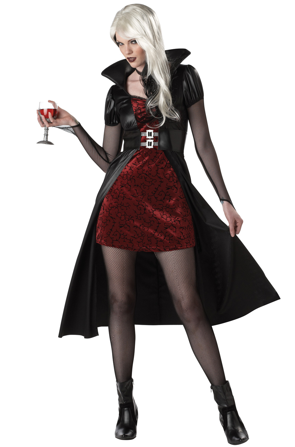 Her beauty will never fade but neither will her thirst. The Blood Thirsty Beauty costume features a red dress with an attached overcoat and belt. Shoes, leggings, necklace, and wig not included.