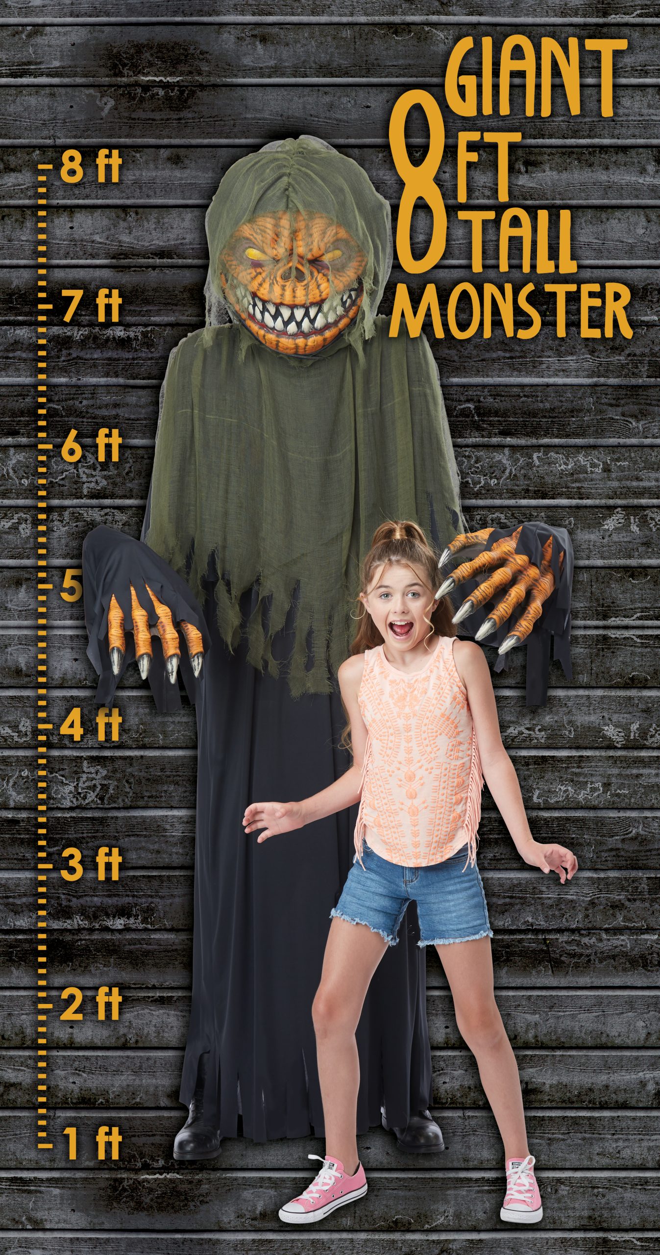 Way too overgrown to harvest the Towering Terror Pumpkin is a huge costume! By using an inflatable head/shoulder piece and pumpkin mask the costume can add more than 2 feet of height to the wearer. A fabric panel in the costume "chest" lets you see out of. With extra included components this costume can also be used as a hang up decoration. The included components are: Oversized robe with hood, Pumpkin mask cover, Inflatable head/shoulder piece, Monster hands, Inflatable arms for decor use and 20ft of cord for decor use.