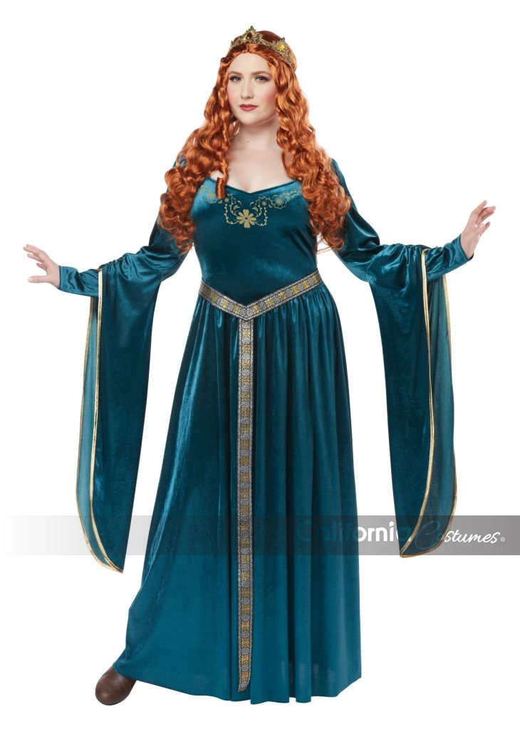The Queen of the Round Table. The Lady Guinevere plus sized costume is a blue dress with long flowing flared sleeves. It includes a crown and belt with vertical stripe. Shoes not included