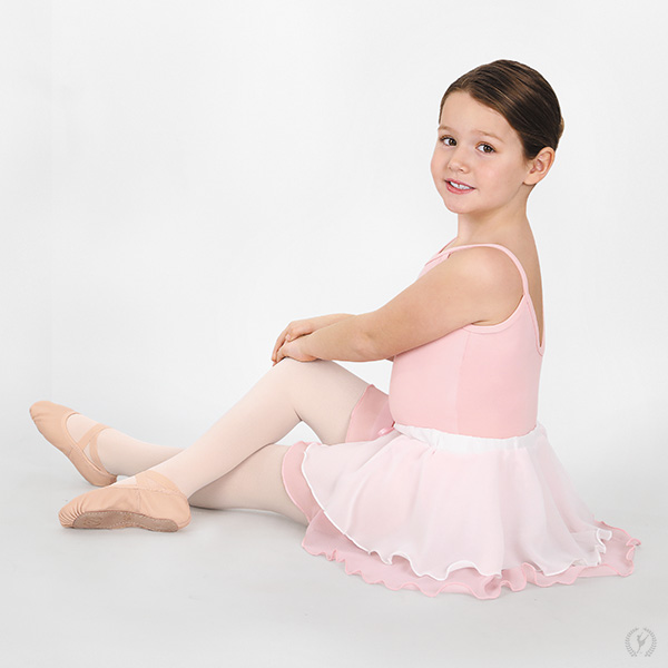 This double layer, mock wrap skirt has an adorable ribbon pin that can be removed for wash and wear if desired. Featuring a covered elastic waistband, this pull on ballet skirt is a sweet starter option for a gloriously girly look. The black and lilac colors are tone on tone, while the light blue and pink colors feature a white top layer of chiffon.