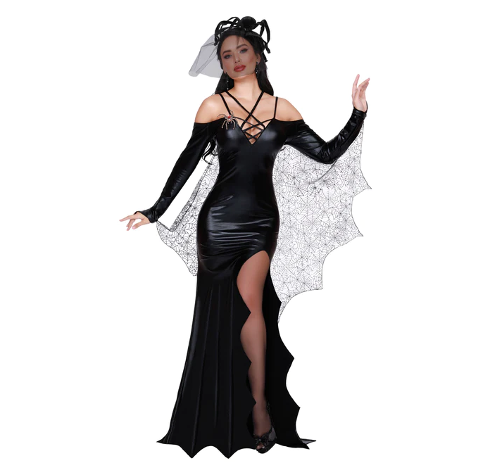 - This costume also features a high scalloped slit and an attached spider web cape