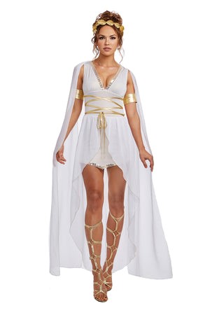 - Mythical Goddess Elegance: Step into the aura of a mythical goddess with this elegant costume. The dress features a sheer overskirt, cascading chiffon sashes, and intricate gold trim embellishments for a truly regal appearance.