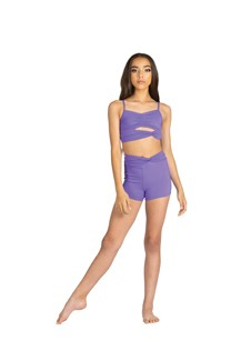 Booty short featuring an asymmetrical twist detail at waistband. Polyester/Spandex.