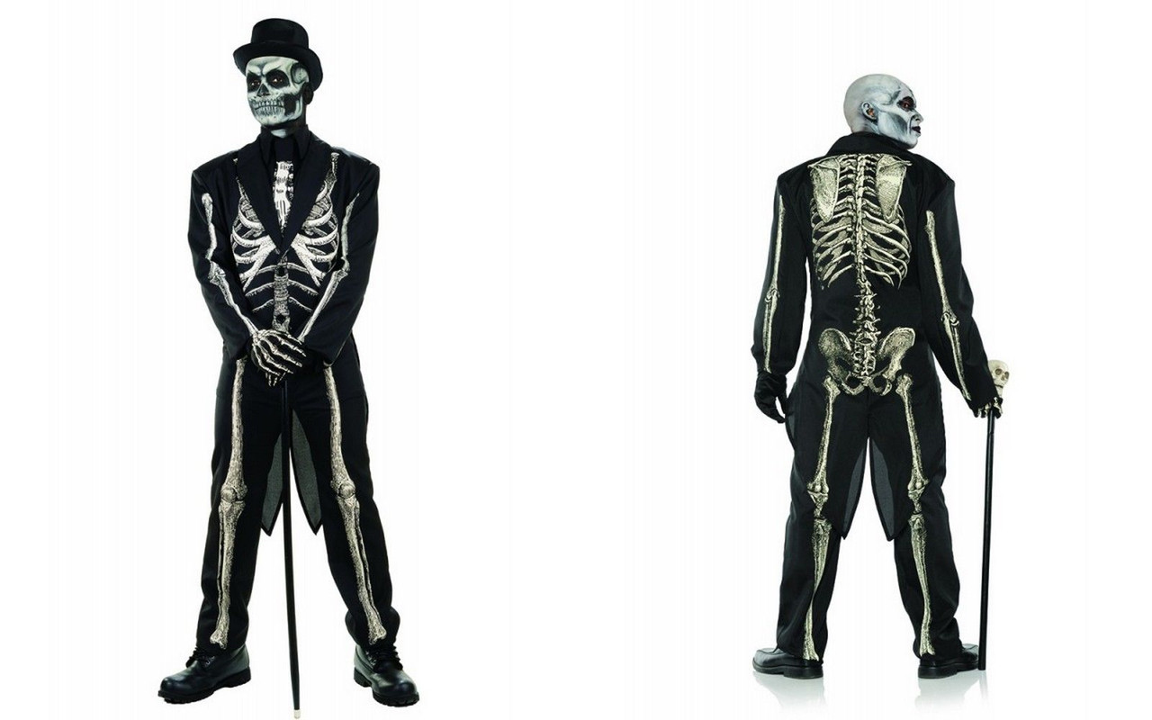 nderwraps Bone Chillin Adult Mens Halloween Costume Includes : -Screen Printed Skeletal Design Tuxedo Jacket With Tails – Faux Shirt front with Tie – Pants – Gloves.