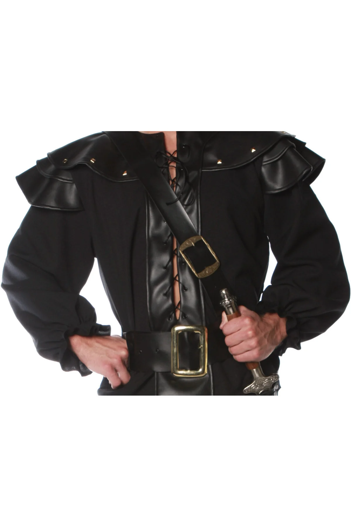 Black faux leather sword belt with bronze metal clasp. There is three straps on the side to secure your sword in place. They measure 2 1/2" in width.