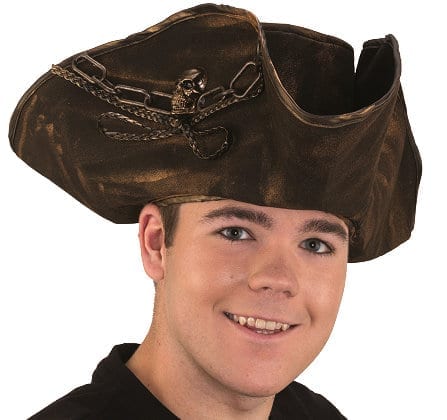 This brown faux leather pirate hat works well with any pirate costume. One size fits most. Made of a fabric, this hat can collapse making it easy for storage or travel. Also includes pirate skull, and braided detailing.