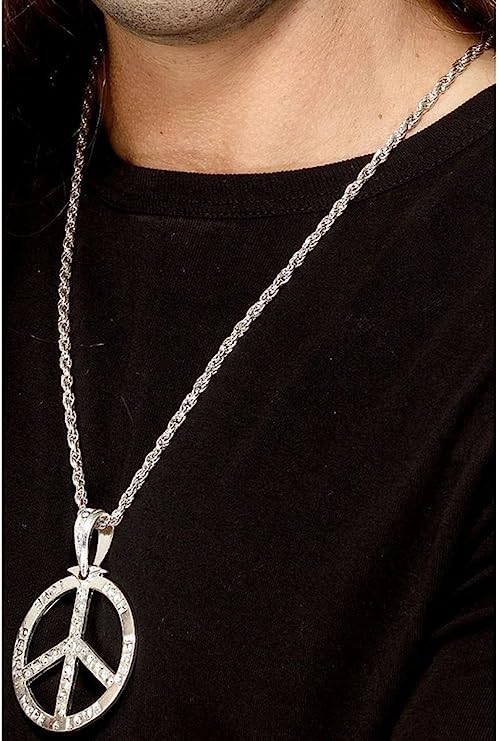 - Adult Unisex 60's Peace Sign Hippie Medallion, Silver, with 44cm Chain, Perfect for carnivals, theme parties or Halloween.