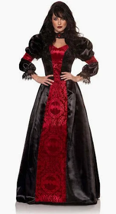 This elegant floor-length red and black dress is made of satin and velvet, adorned with bat motifs.