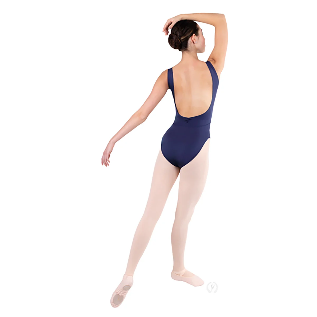 Microfiber tank leotard with boat neck. Carefully positioned tank straps securely swoop down the low back into a delicate pinch. Details include a full front lining and integrated shelf bra.