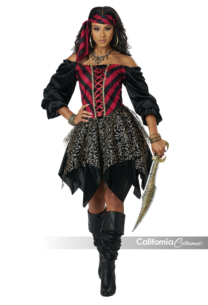 Product Description: Dress features a corset styled bodice (lace up yourself) and a dagged skirt hemline. Sheer fabric overskirt is decorated with a glitter pattern. Dress has an elastic neckline that allows you to wear it around your shoulders. 2 attached ribbon cinch ties on the waist. Headband tie. All that glimmers is mine for the taking. The Women's Glimmering Sea Pirate costumes comes with a dress and head tie/band. The dress features a corset styled bodice with lace up ribbon. The dress skirt and overskirt have dagged hemlines. The overskirt is made of a sheer material and is decorated with glitter. Dress also features an elastic shoulder line and has two cinch ties at the waist.