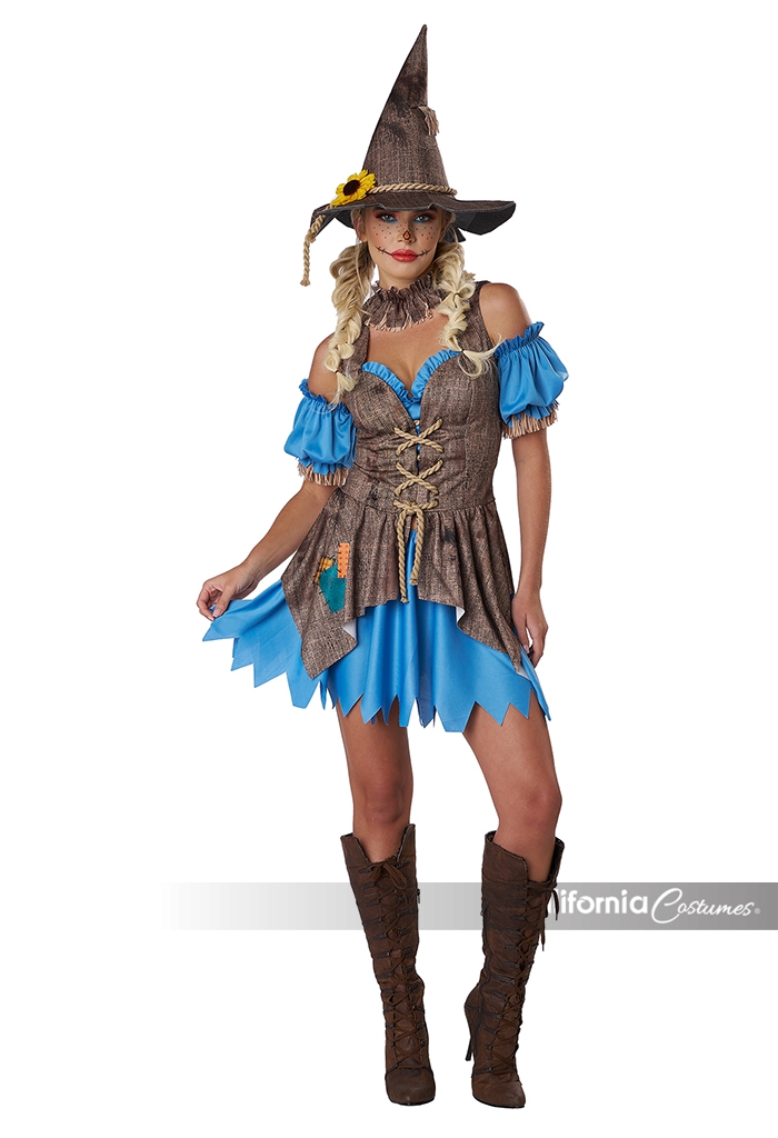 Product Description: Top is composed of a blue neckline inset that is attached burlap print fabric overtop/dress with lace up bodice. Blue underskirt has an elastic waistband. Pair of blue sleeve puffs are decorated with soft "hay" fabric trim. The sleeve puffs are worn with elastic arm bands. Collar is sewn onto an elastic band and is decorated with soft "hay" fabric trim. Hat is backed with foam and comes with a rope trim and fabric flower. Who knew straw could be this sassy? Turn the cornfield into a catwalk in this sexy scarecrow costume. The flirty top features an attached corset that hugs in all the right places, while the underskirt adds to your strut. Includes a set of detached sleeve puffs and a hat complete with a rope tie and a cute flower detail, this look is all charm, no crows!