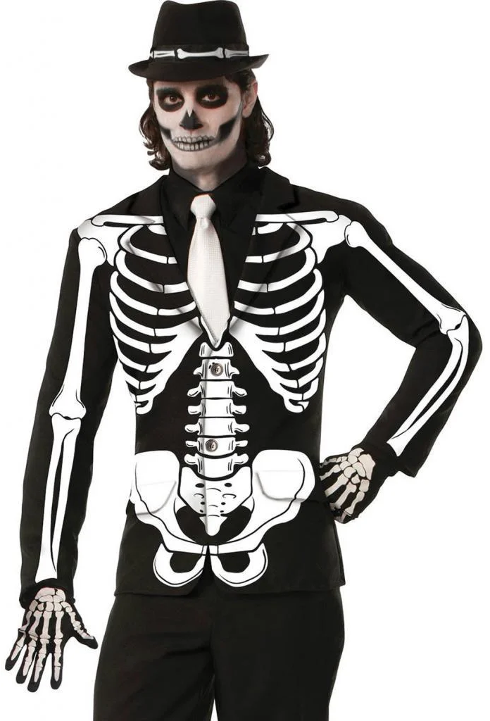 This is a black single breasted jacket which has a skeleton torso printed on the front with the bones of the arm on the sleeves. Please note, the best effect is achieved with the jacket buttoned up and over a black shirt and white tie, not included, as shown. The model is also wearing make-up (or he's having a bad day) and a pair of skeleton gloves plus hat, these are not included but we have a complete range of costume accessories to suit.