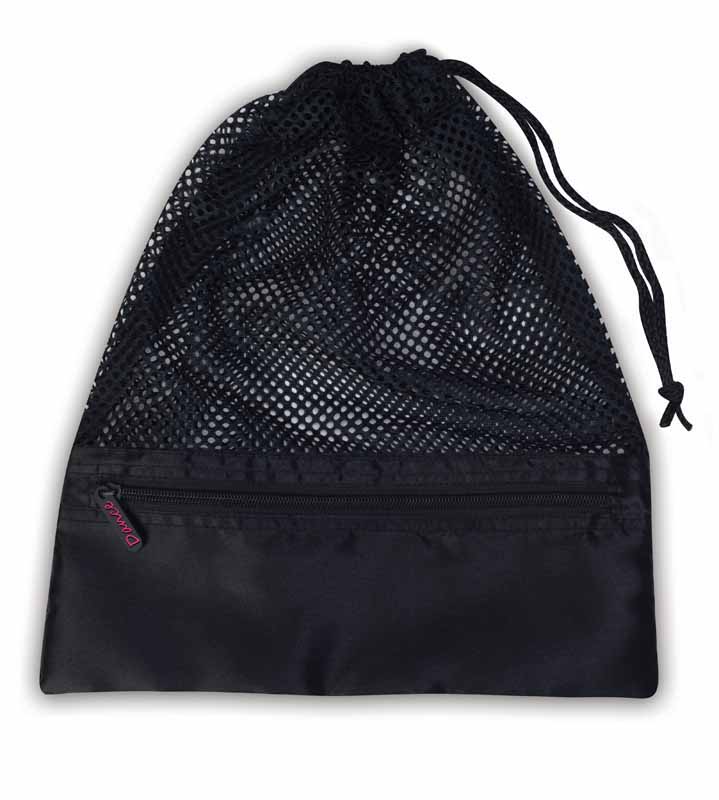 Heavy duty mesh shoe bag with zipper front pocket. Toggle pull top.