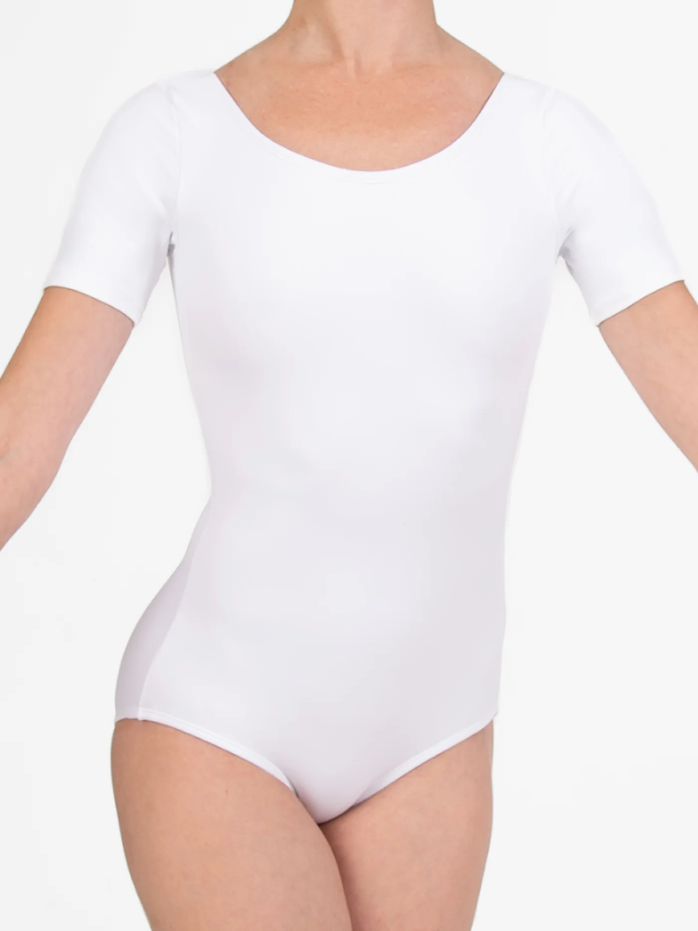 Short sleeve ballet cut leotard. Light colors feature a memory STRETCH front lining.