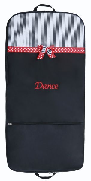 Adorable black and red design with striped screen print, grosgrain polka dot ribbon trim and bow, and embroidered “Dance“. Microfiber material wipes clean.