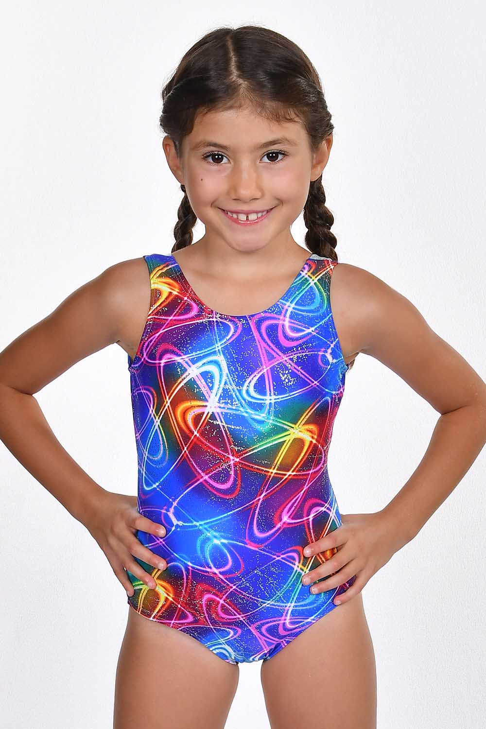 Girls' Rainbow Foil with Silver V Back Leotard for gymnastic of all levels.