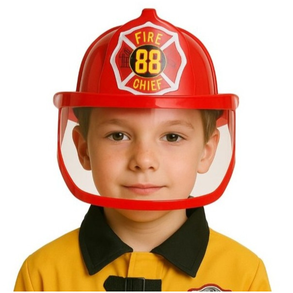 This Childrens Firefighter Shield Helmet features a red fire chief design with a clear front shield for extra flair. Great for Halloween, school events, or dress-up play. A fun accessory for kids who dream of saving the day.