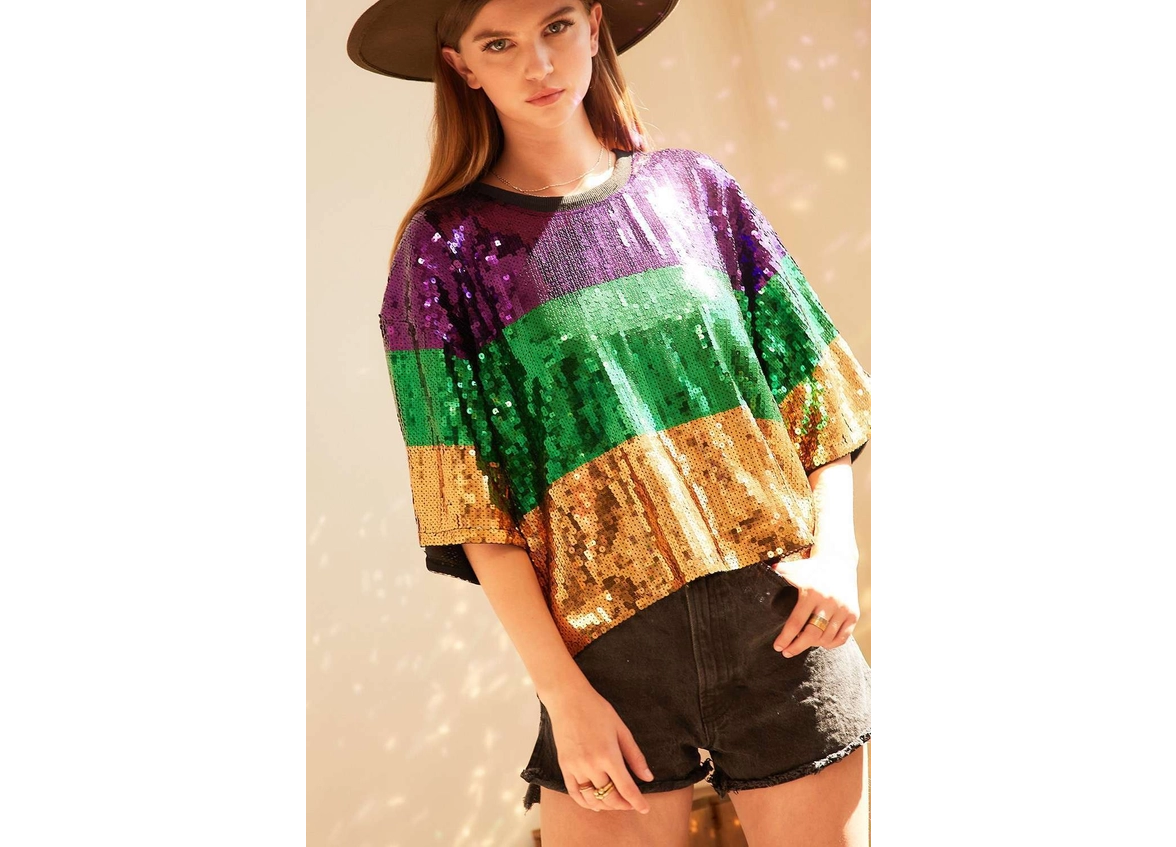 Shine bright and make a statement with our MG Sequin Crop Top. This stylish crop top features sparkling sequins, a trendy crop design, and is a versatile outfit option for any occasion. Perfect for Mardi Gras or adding some fun to your everyday look. Get ready to turn heads and stand out with this glamorous piece!