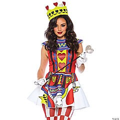 Includes dress with glitter heart accents and oversize card print skirt, neck piece and matching crown.