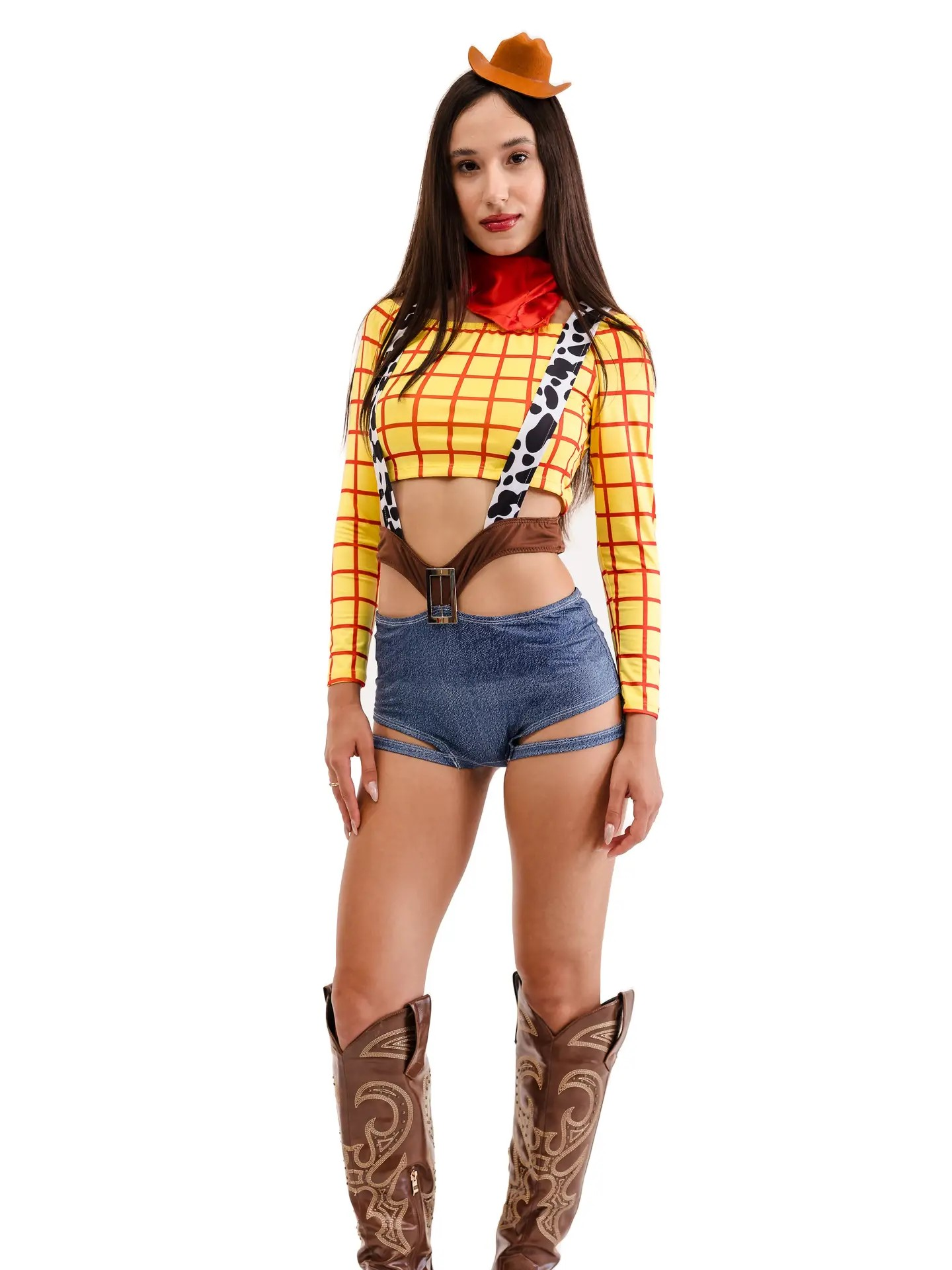Features – Yellow checkered crop top, cow-print suspender romper with shorts and belt detail, red scarf, and mini cowboy hat hair clip.